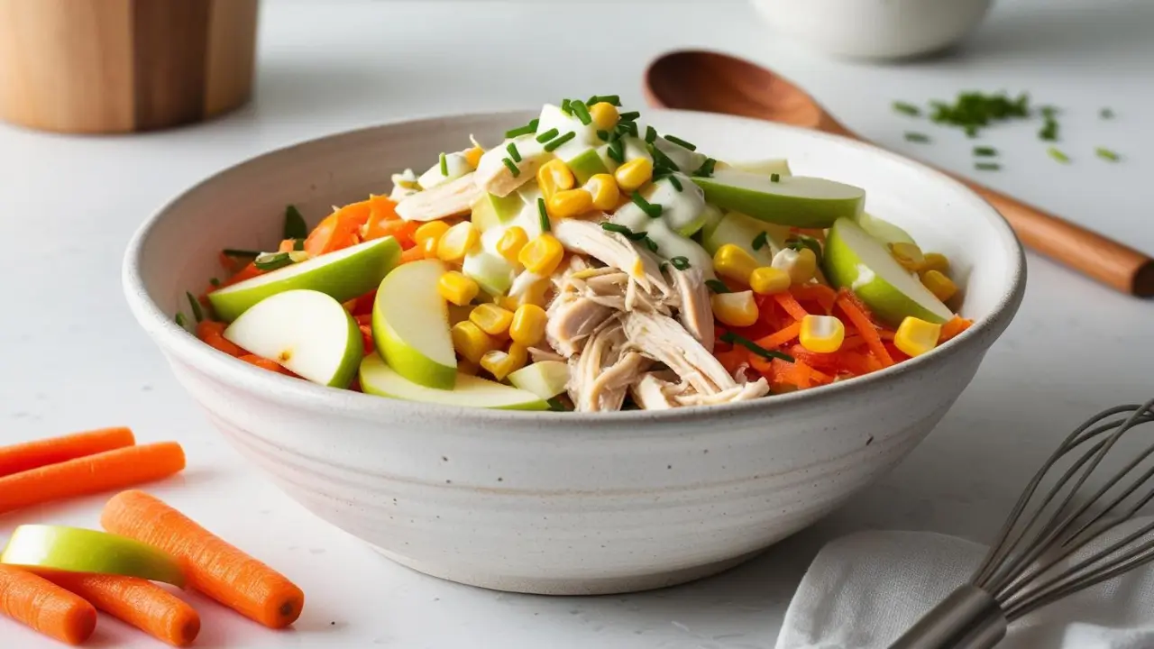 - Em uma tigela grande, junte o frango desfiado, a cenoura ralada, a maçã picada, o milho e as uvas-passas (se for usar).
