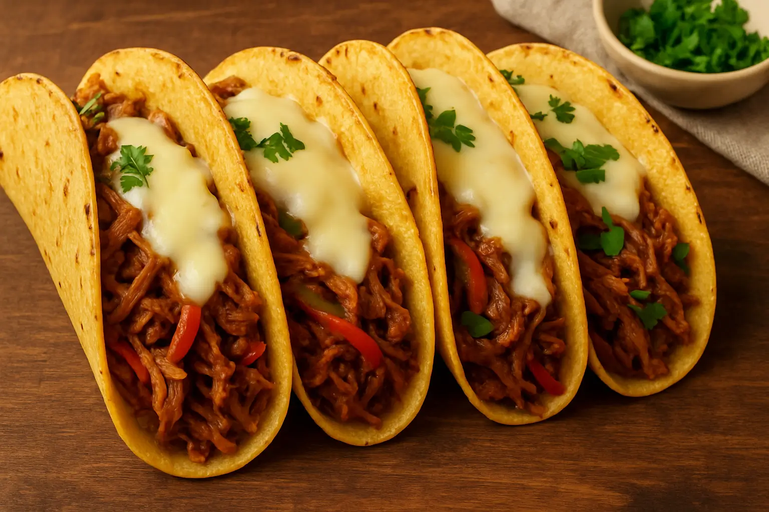 - Recheie cada taco com a carne louca e cubra com o queijo.